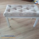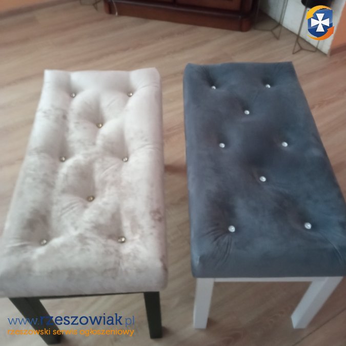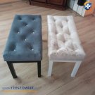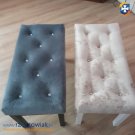 Siedzisko ławki oparte jest na stelażu bukowym.Jedna ławka jest w kolorze beżowym pikowana złotymi kryształkami a druga jest w kolorze szarym pikowana kryształkami