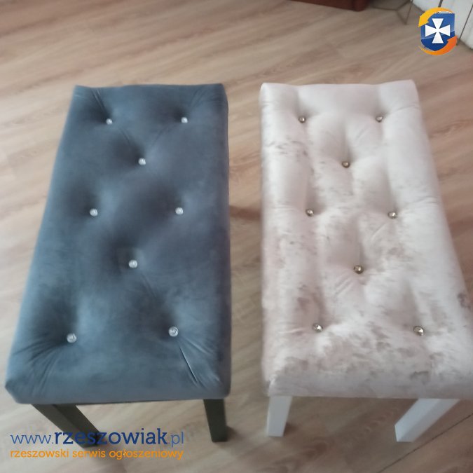 Siedzisko ławki oparte jest na stelażu bukowym.Jedna ławka jest w kolorze beżowym pikowana złotymi kryształkami a druga jest w kolorze szarym pikowana kryształkami