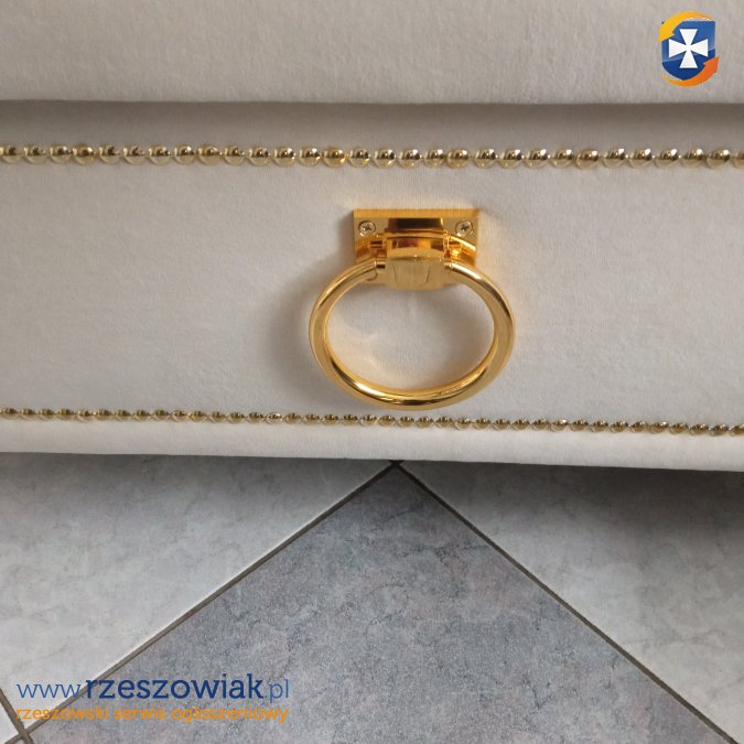 Witam mam do sprzedania nową pufe w kolorze beżowym z kołatką i pinezkami w kolorze złotym na nogach Ludwik o wymiarach 80/40 wys 45 w cenie 390 zł. Tel 606114995