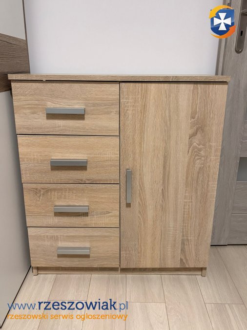 Witam! Praktyczna komoda w kolorze jasnego dębu, wyposażona w 4 szuflady oraz 1 drzwi. Mebel ten doskonale sprawdzi się w salonie, sypialni lub przedpokoju, zapewniając dodatkową przestrzeń do przechowywania. Solidna konstrukcja i nowoczesny design czynią go atrakcyjnym wyborem. Stan b.dobry bez uszkodzeń. Wymiary szerokość 79 cm, wysokość 88 cm, głębokość 34 cm.