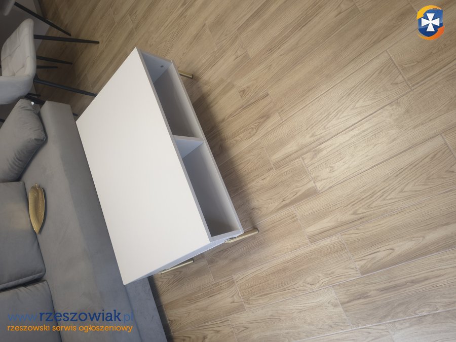 Witam. Sprzeda NOWY Stylowy stolik kawowy w kolorze beżowym, wykonany z wysokiej jakości materiałów. Posiada dwie otwarte półki, które zapewniają dodatkową przestrzeń do przechowywania. Elegancki i funkcjonalny mebel, który doskonale dopełni aranżację salonu.