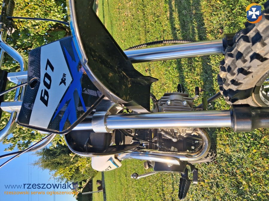 Sprzedam crossa XTR 607 z 2024 roku. Motocykl wyposażony w niezawodny, 4-suwowy silnik o pojemności 125 cc oraz manualną, 5-biegową skrzynię biegów.