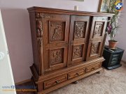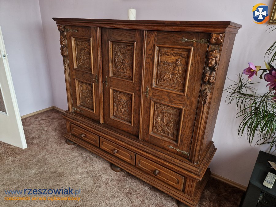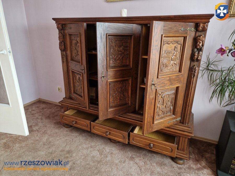 stylowy, drewniany kredens z rzeźbionymi frontami szuflad i drzwiczek. Mebel wykonany z drewna, w ciemnym, ciepłym odcieniu. Posiada wiele praktycznych szuflad i schowków, które zapewniają dodatkową przestrzeń do przechowywania. Kredens będzie doskonałą ozdobą każdego wnętrza, nadając mu elegancki i klasyczny charakter.