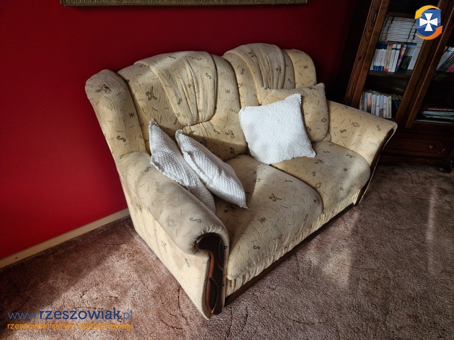 wygodna i stylowa sofa w beżowym kolorze, z delikatnymi wzorami oraz drewnianymi zdobieniami, doskonale pasująca do każdego wnętrza. Mebel jest używany, ale w dobrym stanie. Sofa zapewni komfort i przytulną atmosferę w Twoim mieszkaniu.