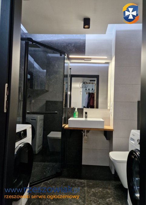Mieszkanie urządzone jest w wysokim standradzie: pralka, suszarka, zmywarka, ogrzewanie podłogowe, rolety zewnętrze sterowane pilotem. W pokoju znajduję się łóżko/kanapa, szafa, biurko.
