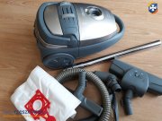 w zestawie wąż flexi, rura teleskopowa , szczotka z włosia do parkietów i podłóg , turboszczotka , małe ssawki Odkurzacz posiada zwijacz przewodu, regulację obrotów zapasowy worek