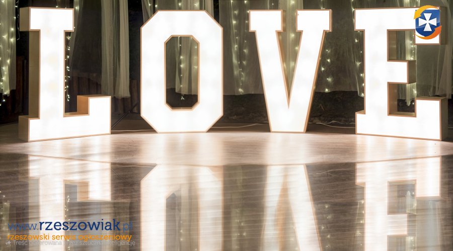 Świetnie sprawdza się na imprezach i weselach. Gwarancja świetnych zdjęć na tle tego napisu.