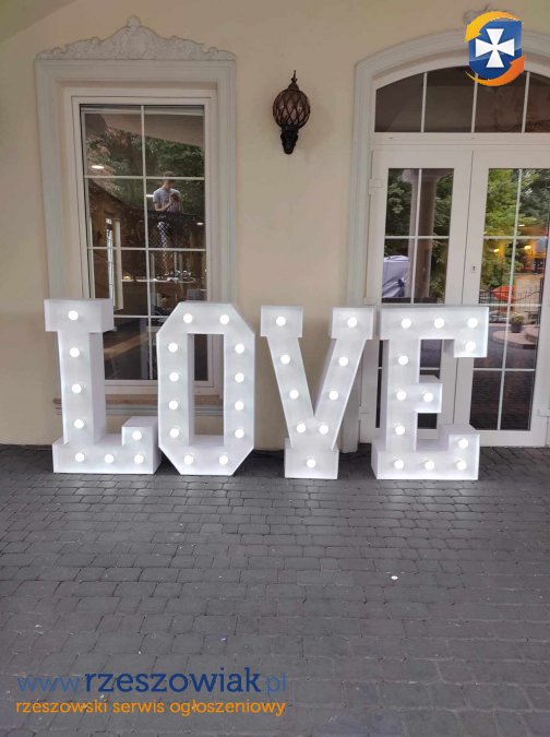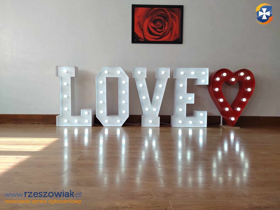 Posiadamy do wynajęcia podświetlany napis LOVE o wysokości 120cm. Napis LOVE może występować w wersji standardowej lub z czerwonym sercem.