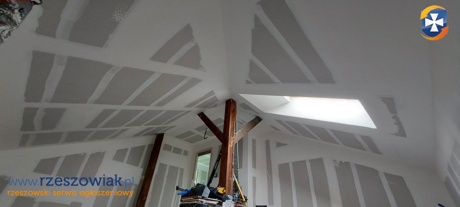 Podstawowy standard wykonania docieplenia oraz zabudowy dachu obejmuje:docieplenie murłaty, sklejanie membrany dachowej,wykonanie stelaża UD/CD, docieplenia wełną mineralną w dwóch warstwach, wykonanie puszek pod oświetlenie, szczelny montaż paroizolacji, montaż płyt gk. Dodatkowo płyty wykańczam do standardu Q2 lub Q4 wszystko zależy jakiego efektu oczekuje klient.