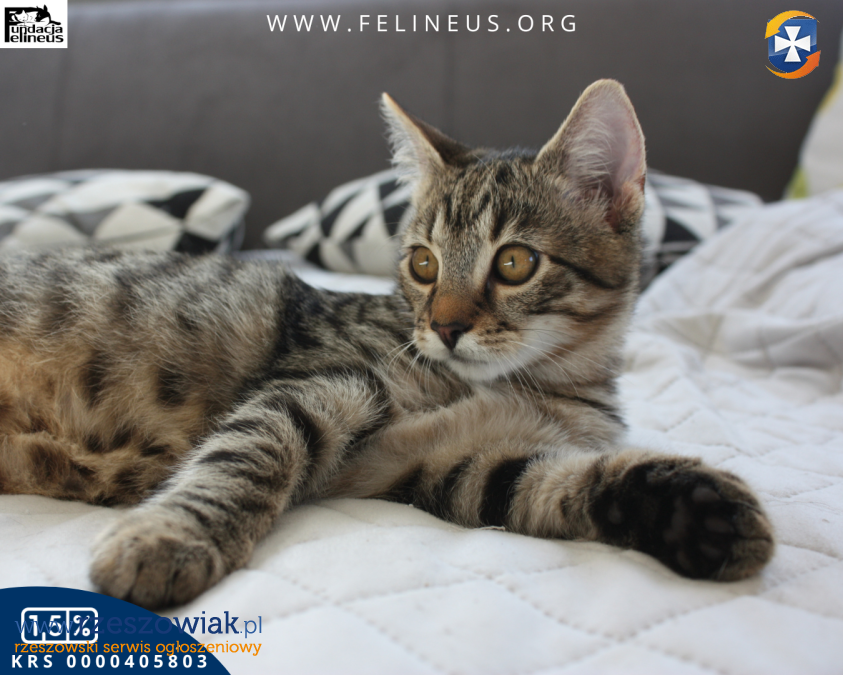 Wrzosik - kocurek urodzony w czerwcu 2025. Wrzosik to najbardziej rozmruczany i przytulaśny kocurek jakiego znamy. Na sam widok człowieka włącza się mu tryb "traktor". Kocurek nie widzi świata poza człowiekiem. Chociaż kocim towarzystwem również nie pogardzi. Lubi zabawy z innymi kotami - małymi i dużymi, dlatego poleca się do adopcji w dwupaku lub też chętnie zamieszka w domu gdzie jest już kot. Wrzosik z prędkością świata wbiega na człowieka żeby położyć się mu na kolanach, dać mu kocie całuski lub też żeby być ponoszonym na rękach albo na ramieniu. Ten mały szkrab na pewno szybko skradnie wasze serce. Kocurek szuka domu niewychodzącego z zabezpieczonymi oknami i jeśli jest to balkonem.