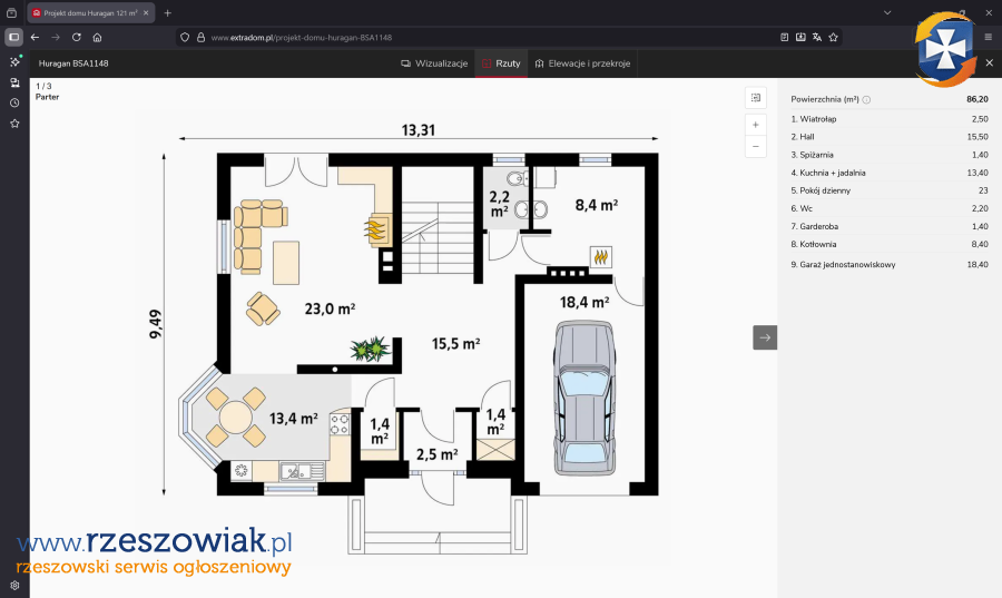 Parter: Wiatrołap:/2.5m2/, Hall/19.4m2/kuchnia +jadalnia/13.4m2/, salon z wyjściem na taras/23m2/, dodatkowy pokój sypialny (zamiast garażu) /18.4m2/, toaleta /2.2m2/, kotłownia/ 8.4m2/
