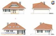 Dom jest zbudowany z pustaka ceramicznego, ocieplony styropianem 15cm o wysokiej izolacji cieplnej, elewacja wykończona tynkiem, posiada wstępne wylewki, okna PCV i parapety w kolorze złoty dąb, 4 okna dachowe + duże okno na poddaszu o zaokrąglonym kształcie, dach wielospadowy pokryty blachodachówką w kolorze grafitowym typu gont, kominy wykonane z cegły klinkierowej z dodatkowym przewodem do instalacji kominka w salonie, schody betonowe na poddasze, drzwi antywłamaniowe, wejściowe.