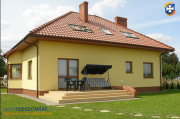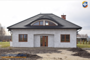 Dom jest zbudowany z pustaka ceramicznego, ocieplony styropianem 15cm o wysokiej izolacji cieplnej, elewacja wykończona tynkiem, posiada wstępne wylewki, okna PCV i parapety w kolorze złoty dąb, 4 okna dachowe + duże okno na poddaszu o zaokrąglonym kształcie, dach wielospadowy pokryty blachodachówką w kolorze grafitowym typu gont, kominy wykonane z cegły klinkierowej z dodatkowym przewodem do instalacji kominka w salonie, schody betonowe na poddasze, drzwi przeszklone, wejściowe, wyjście na taras od strony południowo-zachodniej.