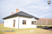 Dom jest zbudowany z pustaka ceramicznego, ocieplony styropianem 15cm o wysokiej izolacji cieplnej, elewacja wykończona tynkiem, posiada wstępne wylewki, okna PCV i parapety w kolorze złoty dąb, 4 okna dachowe + duże okno na poddaszu o zaokrąglonym kształcie, dach wielospadowy pokryty blachodachówką w kolorze grafitowym typu gont, kominy wykonane z cegły klinkierowej z dodatkowym przewodem do instalacji kominka w salonie, schody betonowe na poddasze, drzwi przeszklone, wejściowe, wyjście na taras od strony południowo-zachodniej.