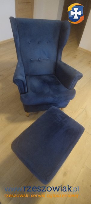 Wygodny fotel uszak z otwieranym podnóżkiem, kolor granatowy, materiał welur. Stan dobry.