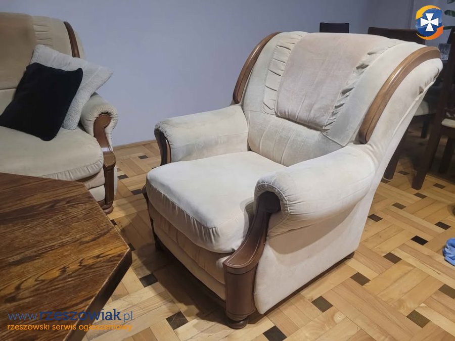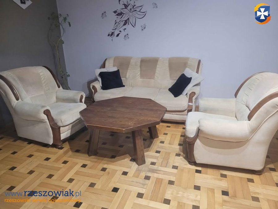 Wygodny, stylowy zestaw wypoczynkowy w jasnych kolorach. Składa się on z wygodnej sofy oraz dwóch foteli. Drewniany, ośmiokątny stolik pośrodku dopełnia całość. Całość prezentuje się elegancko i nadaje wnętrzu przytulny charakter.