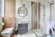 W łazience duża kabina prysznicowa, pralka i lustro z podświetleniem.
