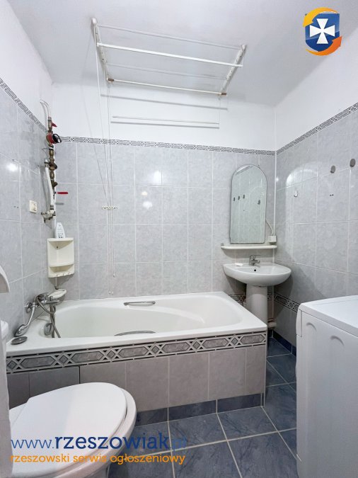 - w łazience: wanna, lustro, umywalka, kompakt wc, pralka.