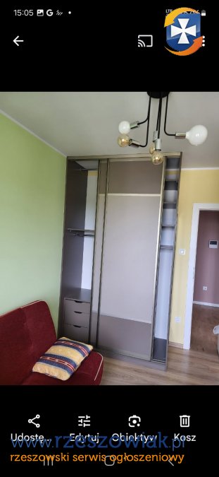 Wynajmę mieszkanie 50 m2 przy ul. Wołyńskiej w Rzeszowie. Mieszkanie składa się z dwóch oddzielnych pokoi, kuchni, łazienki, przedpokoju i dużego balkonu. Mieszkanie umeblowane, w oknach roletki i moskitiery. Do mieszkania przynależy komórka gospodarcza na półpiętrze 5,5 m2, komórka w piwnicy 6 m2 oraz miejsce garażowe. Opłata za całość 2.900 PLN/m-c plus energia elektryczna wg zużycia.