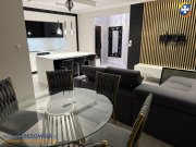 Salon z aneksem kuchennym i wyjściem na balkon (duży balkon o powierzchni 15m2) â wygodna kanapa, TV, stół z krzesłami, meble kuchenne z wyposażeniem AGD (zmywarka, lodówka, piekarnik, mikrofalówka)