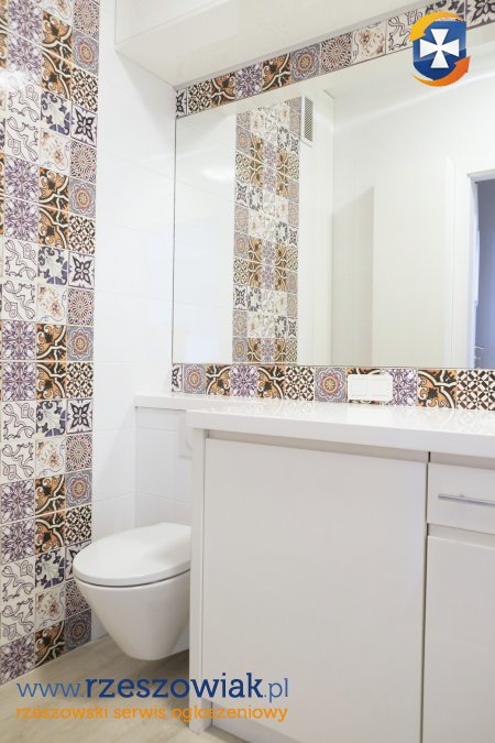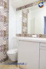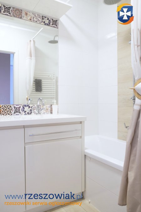 - w łazience: umywalka i pralka w zabudowie szafkowej, wisząca szafka, wanna, pralka, kompakt wc, duże lustro,