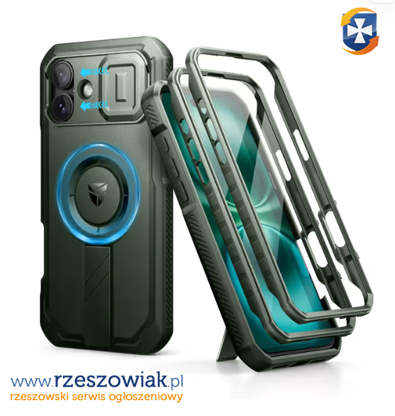 Opis: Etui kompatybilne z MagSafe, z ochroną ekranu i kickstandem. Militarna ochrona, antypoślizgowe, pełne pokrycie aparatu.