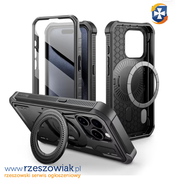 Opis: Etui kompatybilne z MagSafe, z wbudowaną ochroną ekranu i stojakiem. Ciężka ochrona militarna, antypoślizgowe boki, precyzyjne wycięcia na porty.