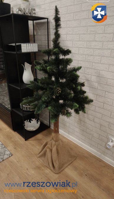 Wysokość około 150 cm, szerokość około 60 cm. Sztuczna choinka na pniu, w worku jutowym. Odbiór osobisty w Rzeszowie po wcześniejszym uzgodnieniu.
