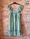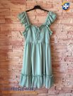 Sukienka mierzona na płasko. Długość całkowita mierzona od ramienia około 90 cm. Szerokość od pachy do pachy 42 cm. szerokość w talii od boku do boku 40 cm. Sukienka jest pomarszczona z tyłu na plecach więc szerokość w talii i w biuście się naciąga. Po więcej szczegółów zapraszam na priv. Sprzedaję za pośrednictwem Vinted lub Olx. Możliwy odbiór osobisty na terenie Łańcuta.