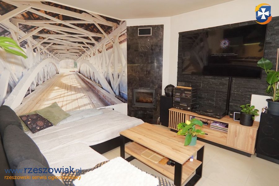 kominek, w kuchni meble na wymiar z agd, w sypialni duża lustrzana szafa