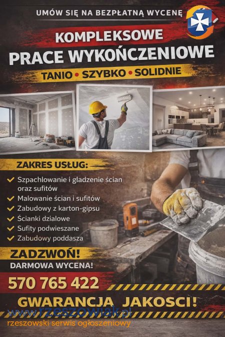 - Szpachlowanie i gładzenie ścian i sufitów - malowanie ścian oraz sufitów - zabudowy poddaszy - zabudowy karton-gipsu - ścianki działowe - sufity podwieszane( GK, Armstrong)