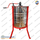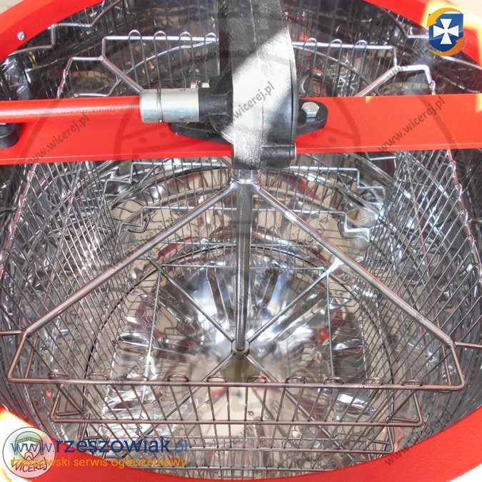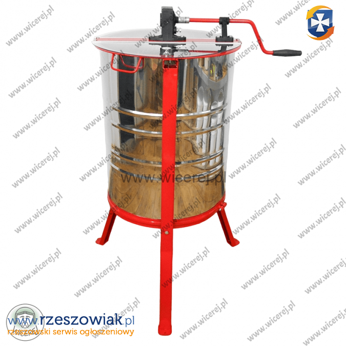 Miodarka, miodziarka, wirówka do miodu 4-ramkowa (nie jest to miodarka kasetowa) uniwersalna na ramki: Wielkopolskie, Warszawskie zwykłe, Warszawskie poszerzane, Dadanta itp. (rozmiar max. Dadant gniazdowa). Miodarka posiada napęd ręczny (koła zębate napędu metalowe).