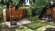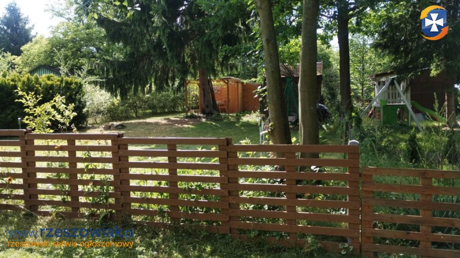 Działka ogrodzona i zagospodarowana tak, aby odpocząć i spotkać się ze znajomymi, jeśli mamy na to ochotę: