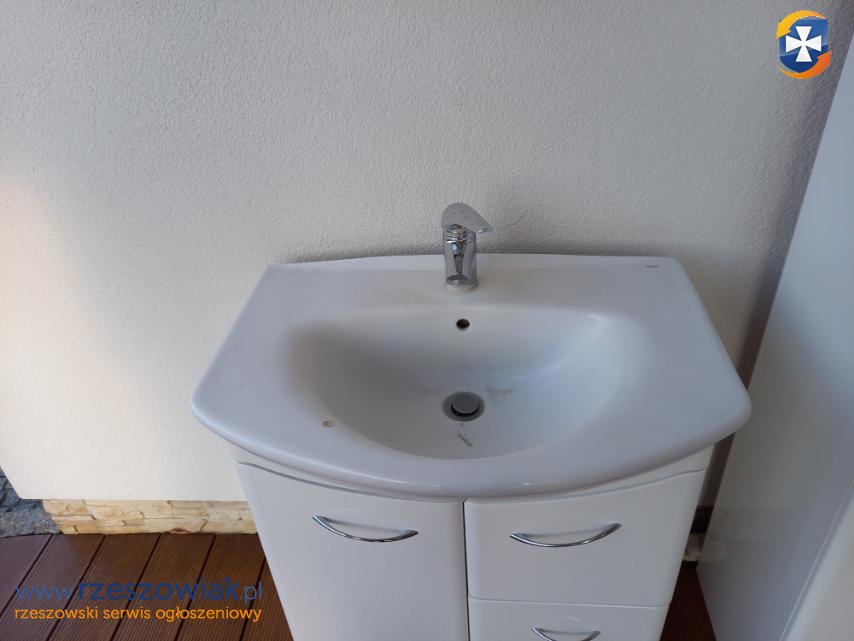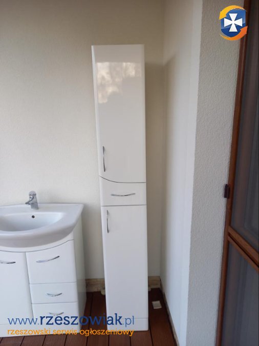 Zestaw mebli łazienkowych w dobrym stanie. Umywalka ceramiczna 70 cm z szafką pod nią i baterią z wężykami. Praktyczne rozwiązanie do małej łazienki. Słupek 20x30x170 cm.