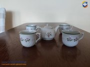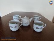 Zestaw porcelanowych filiżanek i czajniczka z kwiatowym motywem. Klasyczny, elegancki zestaw do herbaty lub kawy, który doskonale sprawdzi się w każdej kuchni lub salonie. Przedmioty są w dobrym stanie, gotowe do codziennego użytku brak jest talerzyków. Producent nieznany